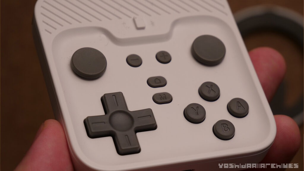 ABXYボタンはスイッチライトくらいのサイズ感、若干丸みを帯びた形状で、遊び少なめ。グニッとしたラバーの押し心地。若干こすれるようなザラッとした感触で、反発感はしっかりあり、静音性は高くも低くもなく標準的です。