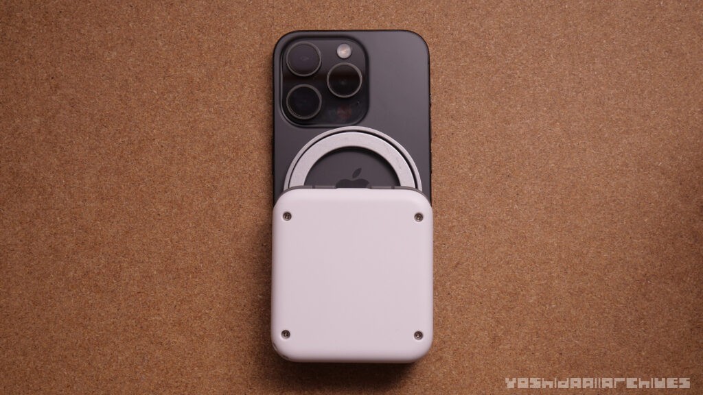 実際に装着してみたのがこちら。スマホの裏に、マグセーフ式バッテリーのように格納して置けるような感じです。iPhone 15 Proでぴったりサイズ。