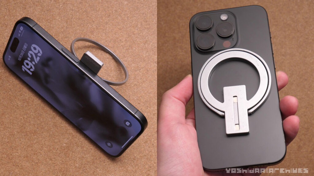 スマホ本体とはマグセーフで固定されます。マグセーフに対応していないAndroid端末の場合はスマホ側に貼り付けるリングが付属するのでそれを使いましょう。