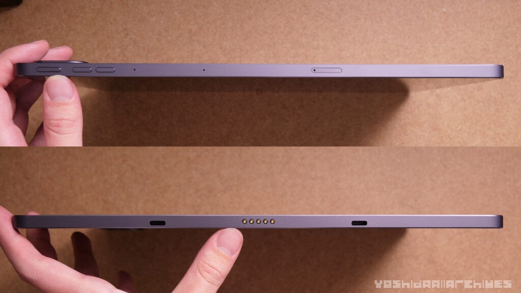 重量は実測値で約710グラム。サイズ感やバッテリー容量を考慮すると妥当ですが、にしても重すぎるので片手で使うのは厳しいです。ちなみに13インチiPad Air Wi-Fi + Cellularモデルは617グラム。