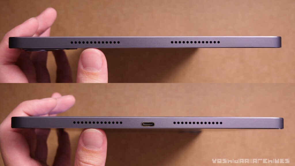 左右合わせて4つスピーカーの穴があり、右側面には中心にUSB-C。イヤホンジャックはありません。