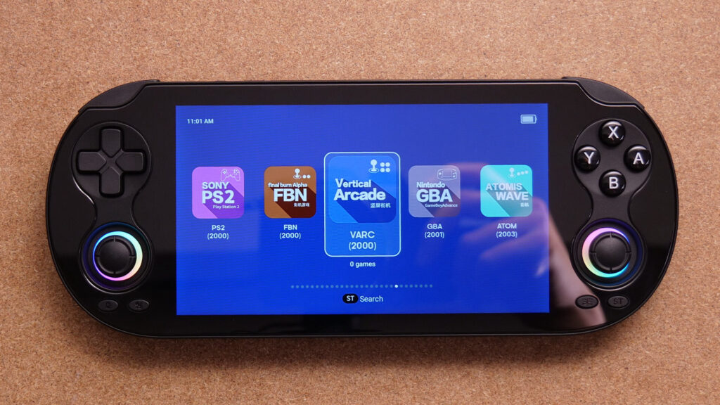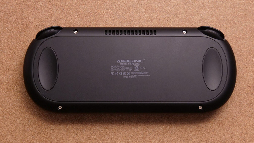 正直に言うと、何でかそこまでVita感を感じませんでした。確かにVitaらしいフォルム、ボタン周りの作りや背面のデザイン、全面ガラス仕様ではありますが、絶妙なボタン配置やスティックサイズ、プロポーションの問題でしょうか。どちらかというと他の横型中華ゲーム機っぽさを感じます。