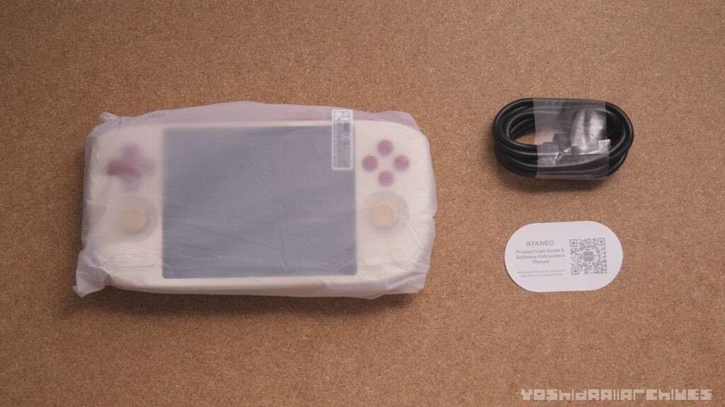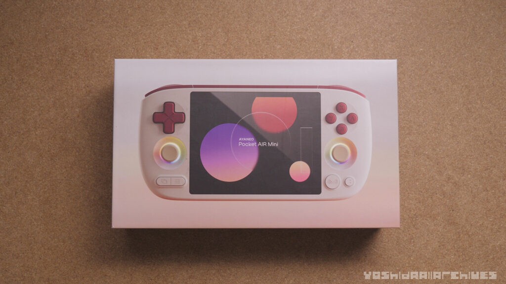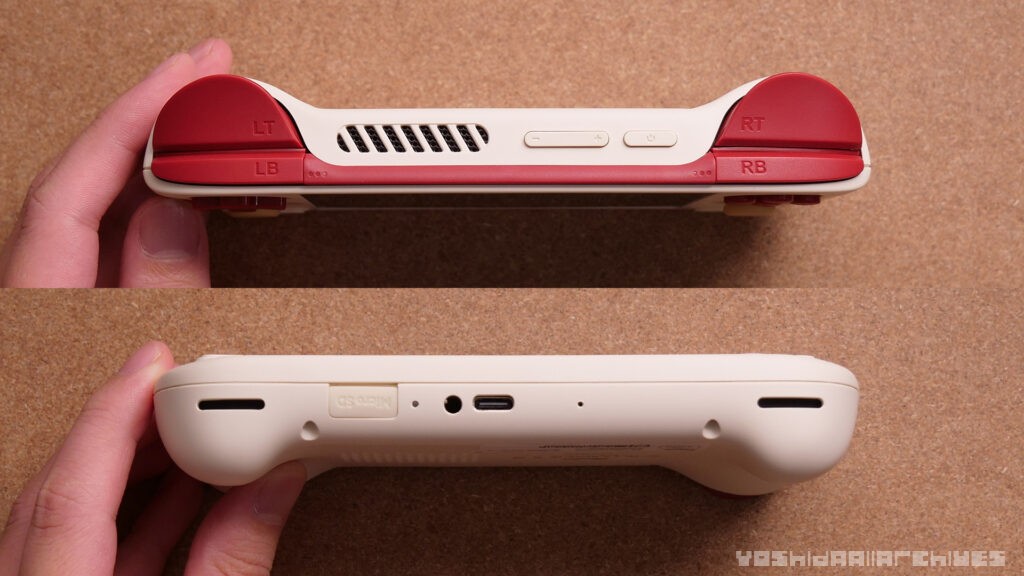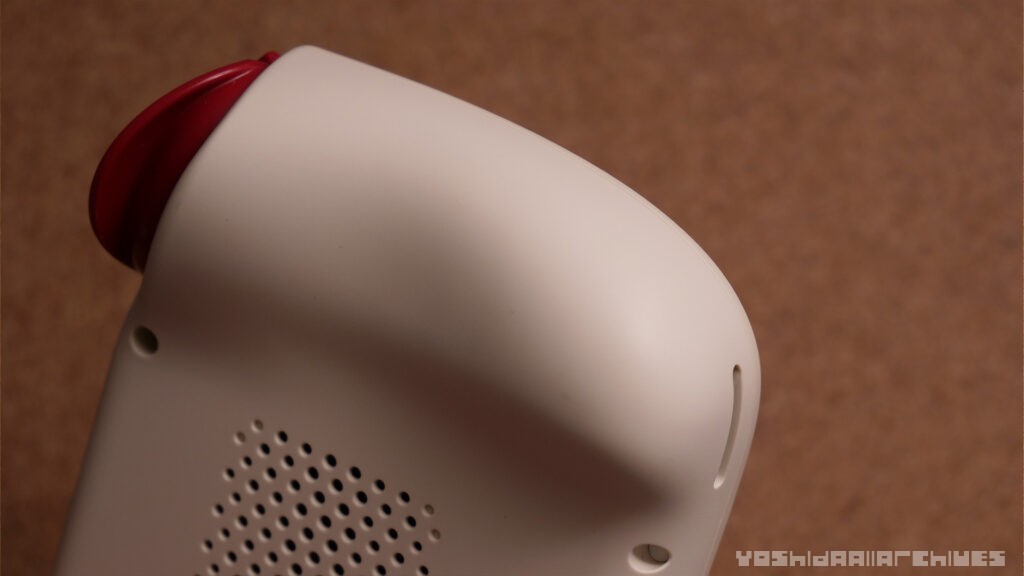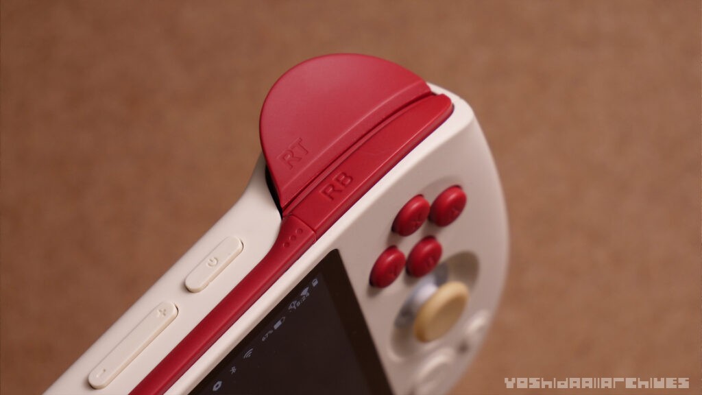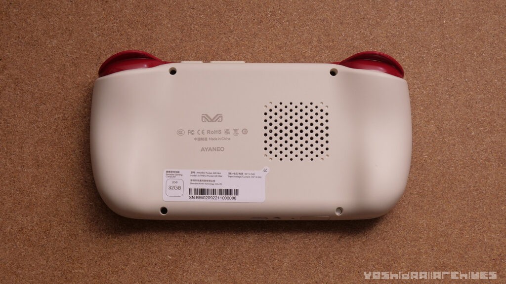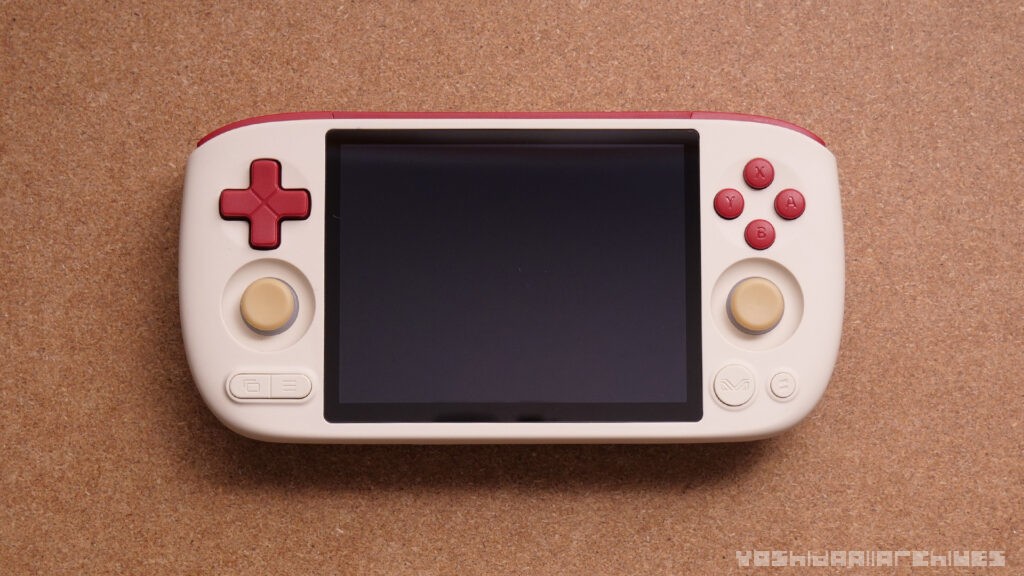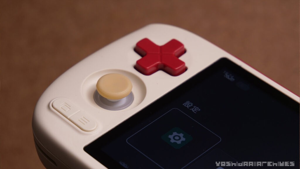 白黒はシンプルな統一されたカラー配色であるのに対して、割と色使いが豊富です。白いボディと赤いボタン。これまでのAYANEO製品で採用されてきたレトロパワー製品とは若干違い、ゲームボーイというよりはファミコンを彷彿とさせるカラーですね。スティックの黄色がかった感じとかかなり独特です。