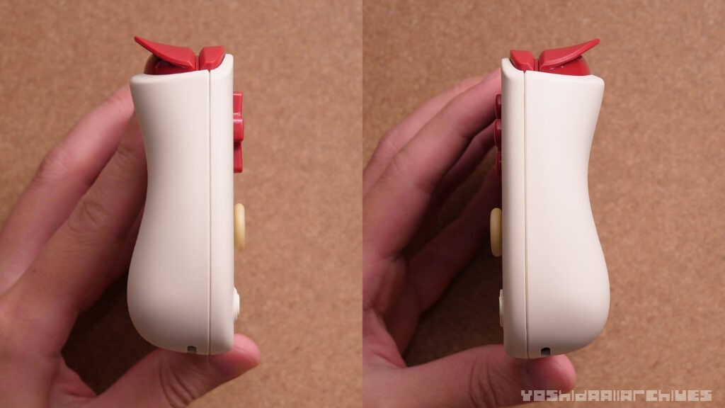 ボタンレイアウト的にはなるべく上側に詰まっていて、指がショルダーボタンの出っ張りに引っかかるような形状にもなっています。フォルム的にもSwitchに近いように感じます。
