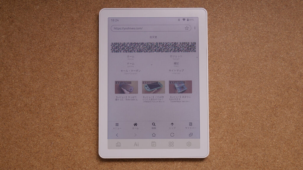 やはり動作感としては快適とは言えません。キビキビとした動作はなく、どうしてもE Inkの仕様上、残像感があるような感じで、一応スマホ的な操作、ブラウジングなどはできるものの、もたつく感じがあるので、割り切って使った方が良さそうです。
