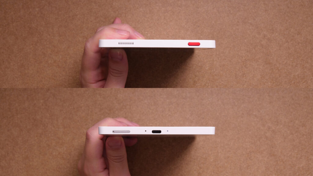 最初手に取った印象としてはかなり好印象です。完全にフラットな板状のフォルムで、カメラ部分の出っ張りもない、ディスプレイ部分の窪みもない、搭載ボタンも電源ボタンだけで超ミニマルです。金属パネルなどは使われていないので高級感はありませんが、一体成形の若干ラメッとしたプラスチックボディは安っぽくありません。