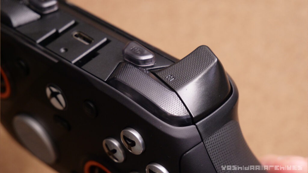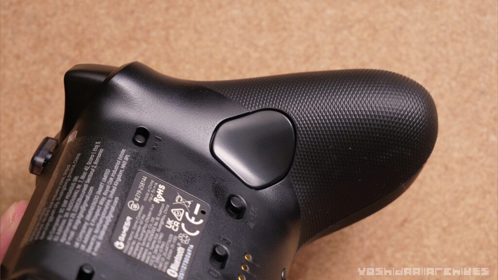 ショルダーボタンは追加ボタンがあり、RBはコツコツとした感触、R5はマウスクリッキーな感触で、RTはストロークが長いトリガーボタンではありますが、切り替えボタンがあるので切り替えるとマウスクリッキーに変更できます。