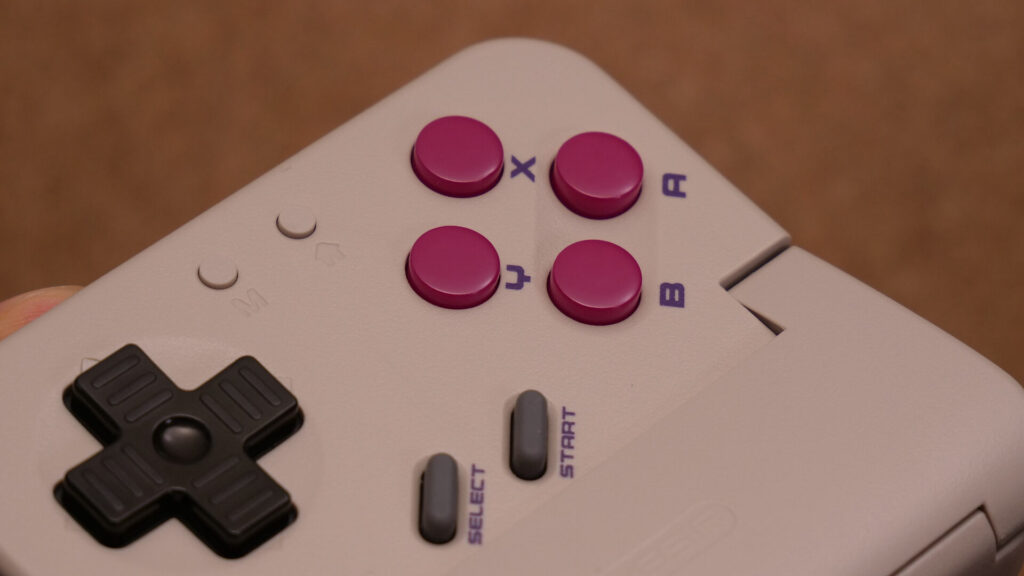 ボタンレイアウトは、右にニンテンドー配列のABXY、左に方向ボタン、上部にホームボタンとMボタン、下部にスタートセレクトボタン