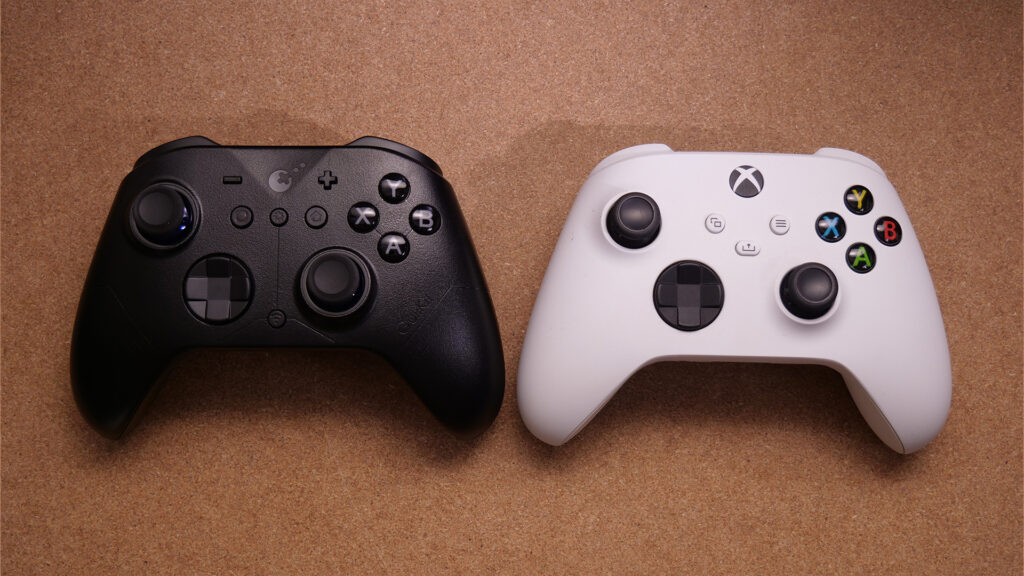 実際にXBOXコントローラーと並べてみました。方向ボタンのフォルムも含め、あまりにも同じすぎるって感じのデザインです。