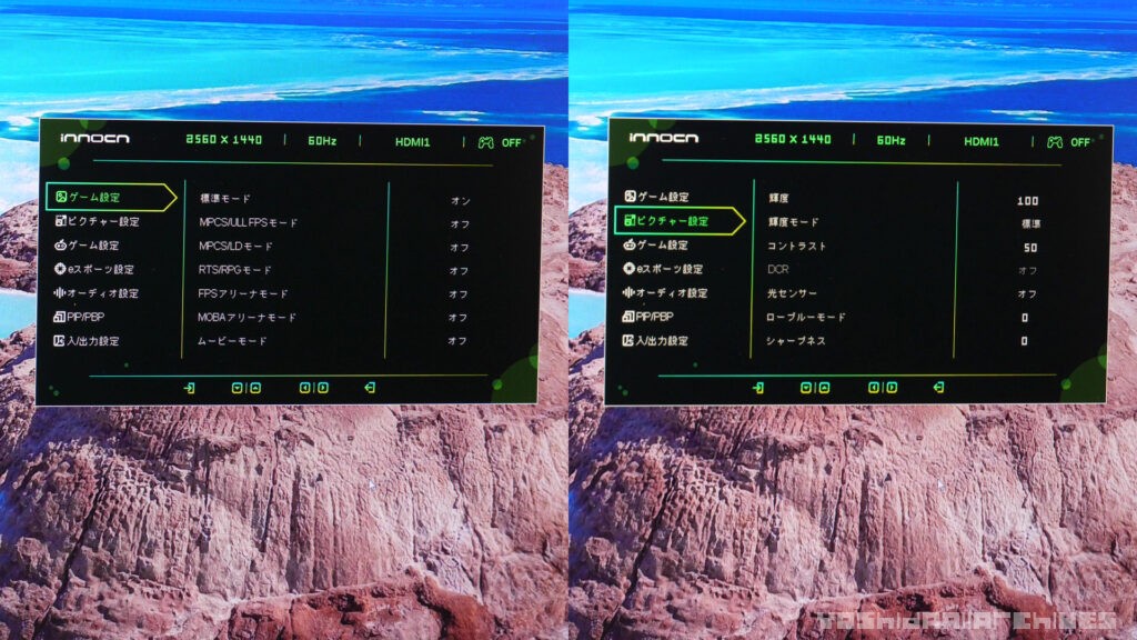 ピクチャーモードでは色味の変更を簡単にできて、設定からは細かな設定変更やLED設定、PIPの設定なども可能。照度センサーが付いているので、明るさの自動調整も可能です。