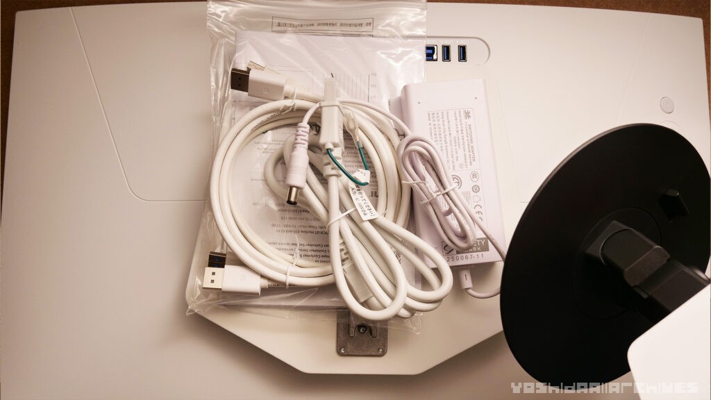 内容物は専用スタンドの土台、アーム、電源アダプターとケーブル、DPケーブル、USB-Bケーブル、説明書類。HDMIではなくDP to DPが入っていたのがちょっと意外でした。HDMIは持ってるでしょ?みたいなことなんですかね。