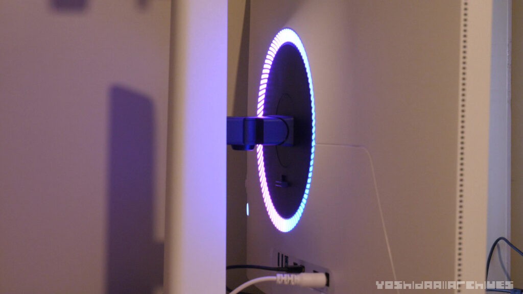 まぁそれはさておき、とりあえず組み上げてみた感想としては白ボディでLEDなども仕込まれていてゲーミング感がたっぷりあります。ディスプレイ下部のロゴ入り部分が目立ちますが、しかしベゼルも特別大きくなく良いです。硬いプラスチックでチープな感触ではありません。