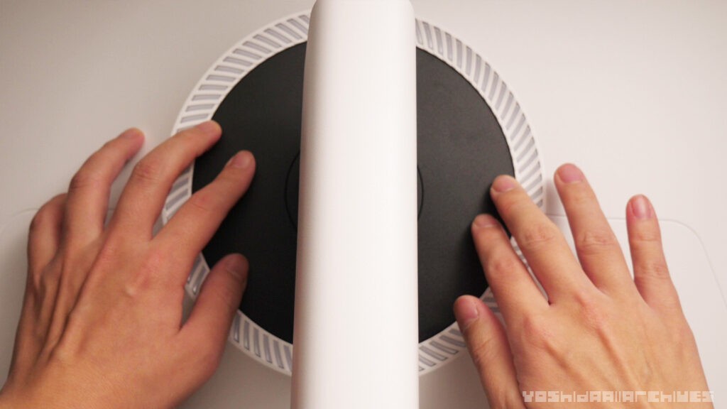 組み立てに工具は特に必要なく、土台とアームの固定も底面のネジを手動で回すだけで簡単、モニター本体とアームの固定も差し込むだけで簡単でした。