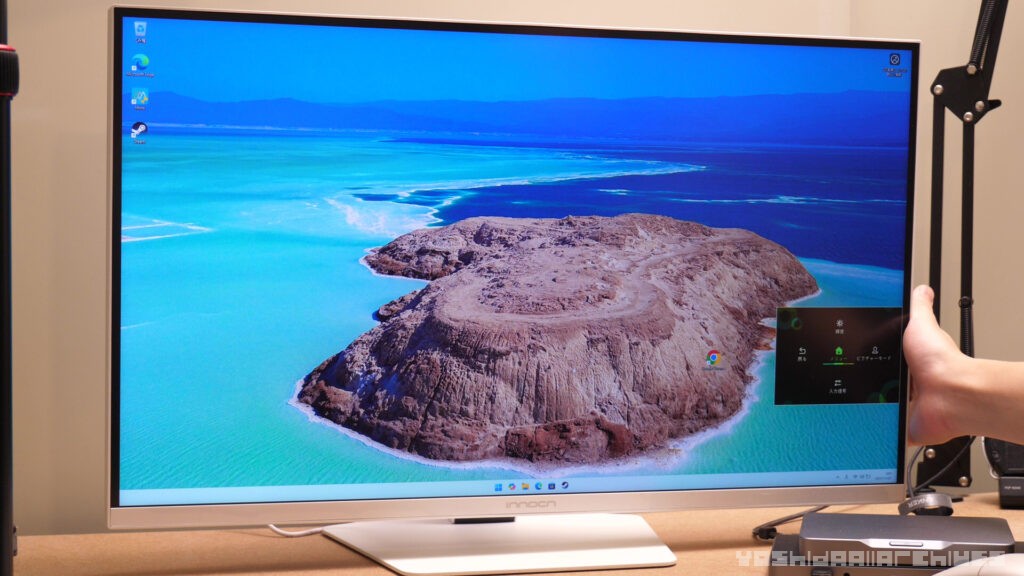 モニターの操作自体は端にジョイスティックと電源ボタンがあります。ジョイスティックはいわゆるアナログスティックっぽい感じですが、倒すとカチッとフィードバックがしっかりあり、気持ちの良い独特な感触です。上下などのボタンで操作するよりも直感的に操作できて良いと感じます。