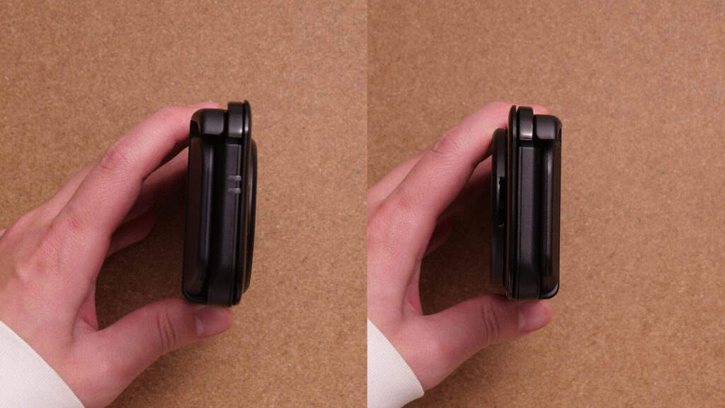 実際に手に持ってみた印象としては、正直かなり重く、重量としてはiPhone15proと合体させた状態だと393g。もう少し軽いスマホで試したいなと感じましたが、とはいえスマホが上に乗っている重量バランスはどう頑張っても良くなることはありません。