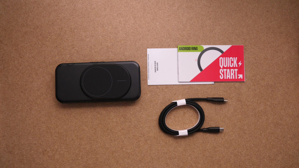 箱を開けると、本体、説明書とMagSafeリング、USB-Cケーブルが入っていました。
