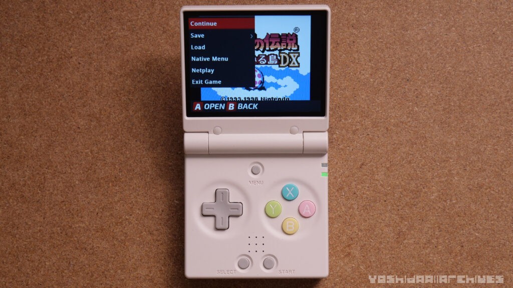 とりあえずGBA SPのように閉じてみると自動的にスリープになり、開くとスリープ解除されます。閉じてしばらく放置していると自動で電源が切れるようになっていて、再度電源を入れると自動でステートロードされてゲームが再開するようになっています。あるあるな仕様ですね。