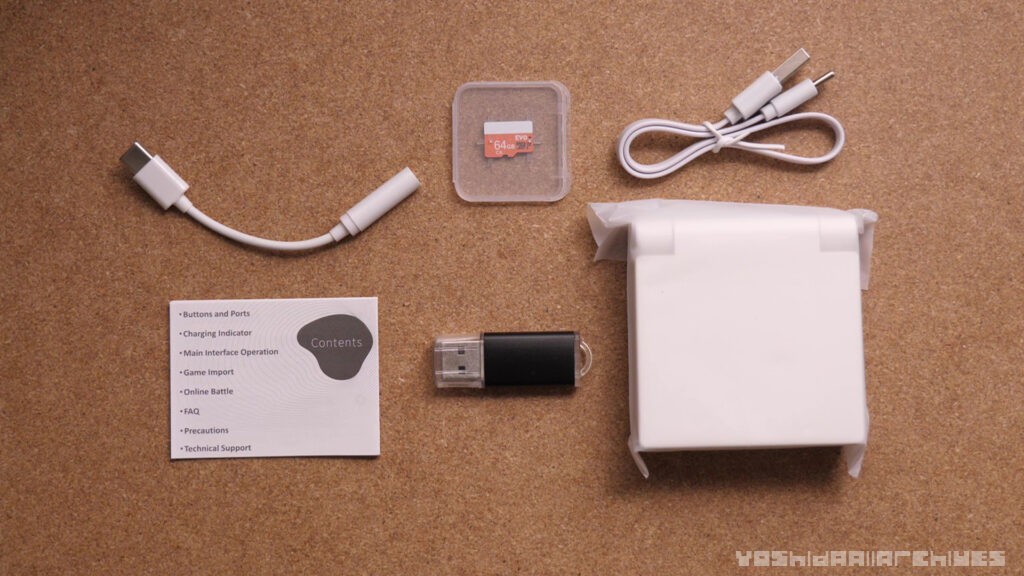 内容物はこちら。USB-Cケーブル、USB-Cイヤホン変換アダプター、説明書、 MicroSDカードリーダー、MicroSD、本体です。
