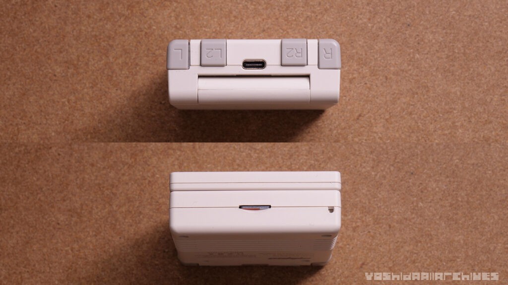 ショルダーボタンも最高、GBASPと同等の形状をしていて、R1R2で段差がついていて押し分けやすく、押した感触も同等です。ポコポコとした軽めの感触。押しやすいし気持ち良いです。