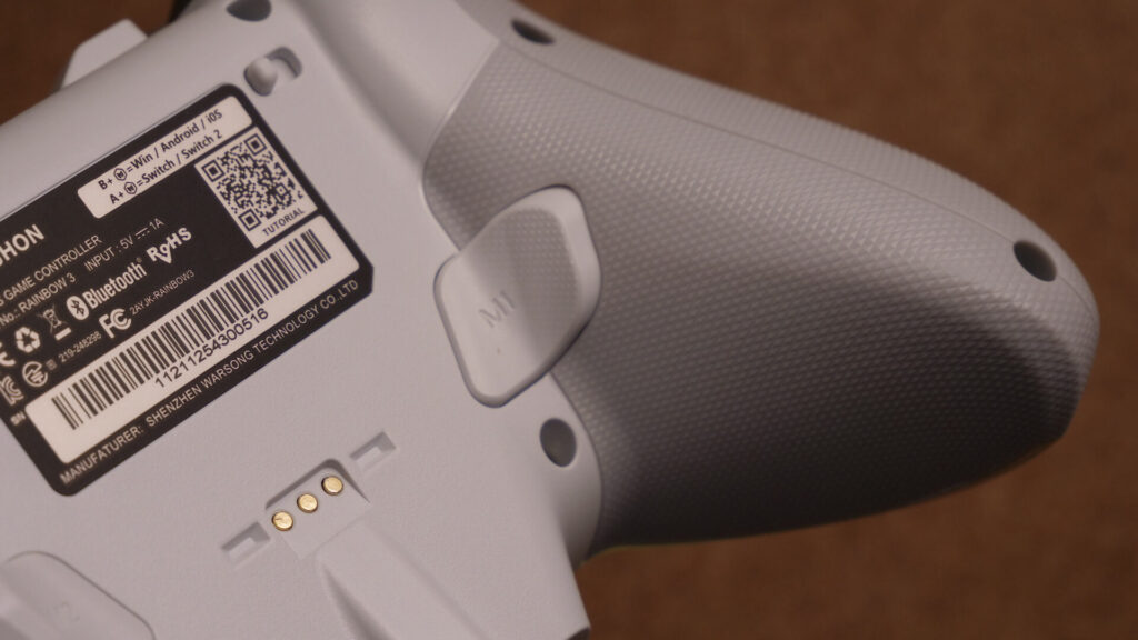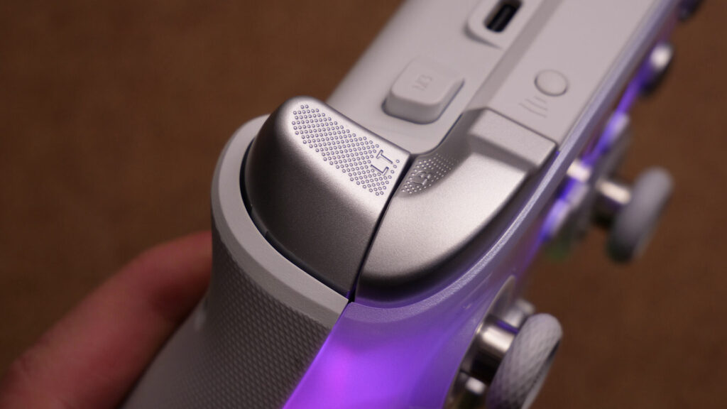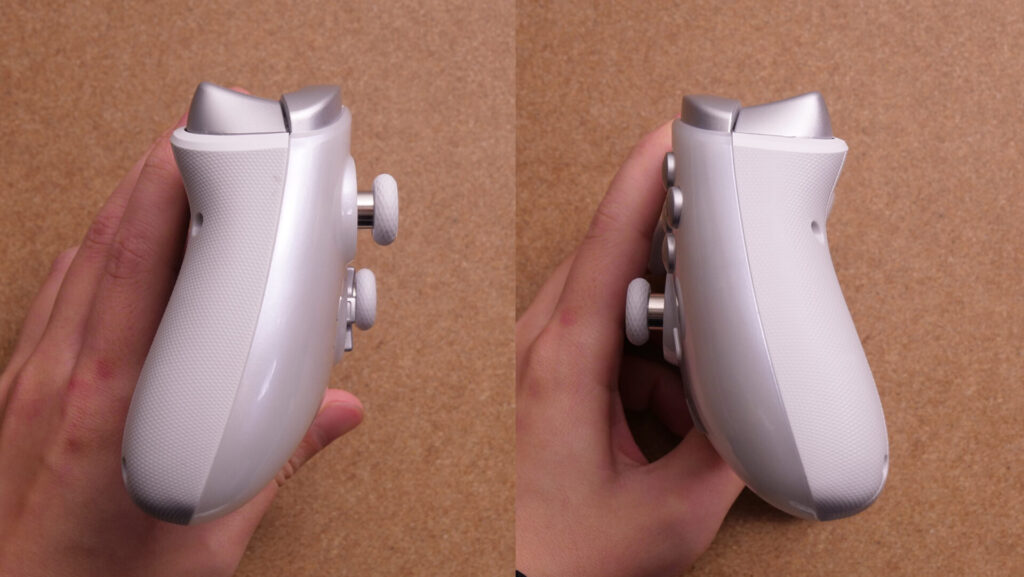 ショルダーボタンはABXYと同じくシルバーカラーのマイクロスイッチ仕様。指が当たる部分には滑り止めのザラザラしているデザインになっています。追加のM3、M4ボタンもマイクロスイッチ仕様です。