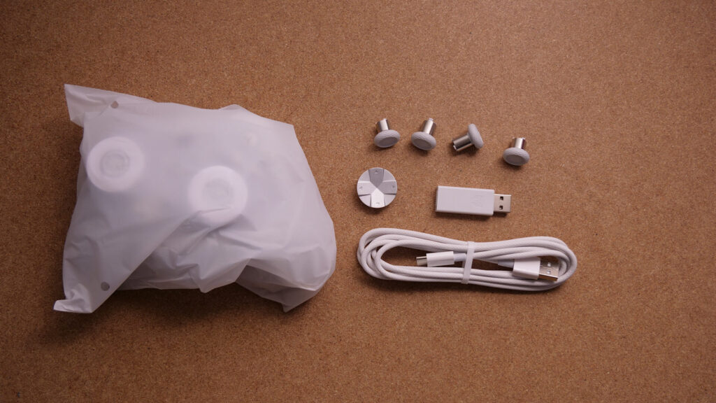 USB-A to USB-Cケーブル、説明書、交換用のDパッド、アナログスティック、NearLinkレシーバーです。