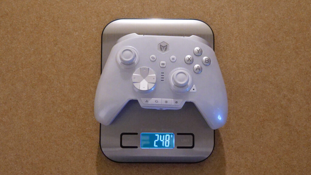 重量は実測値で248グラム。最近のコントローラーにしてはちょい軽めでSwitch2のプロコンより少し重め。絶妙な重さですね。