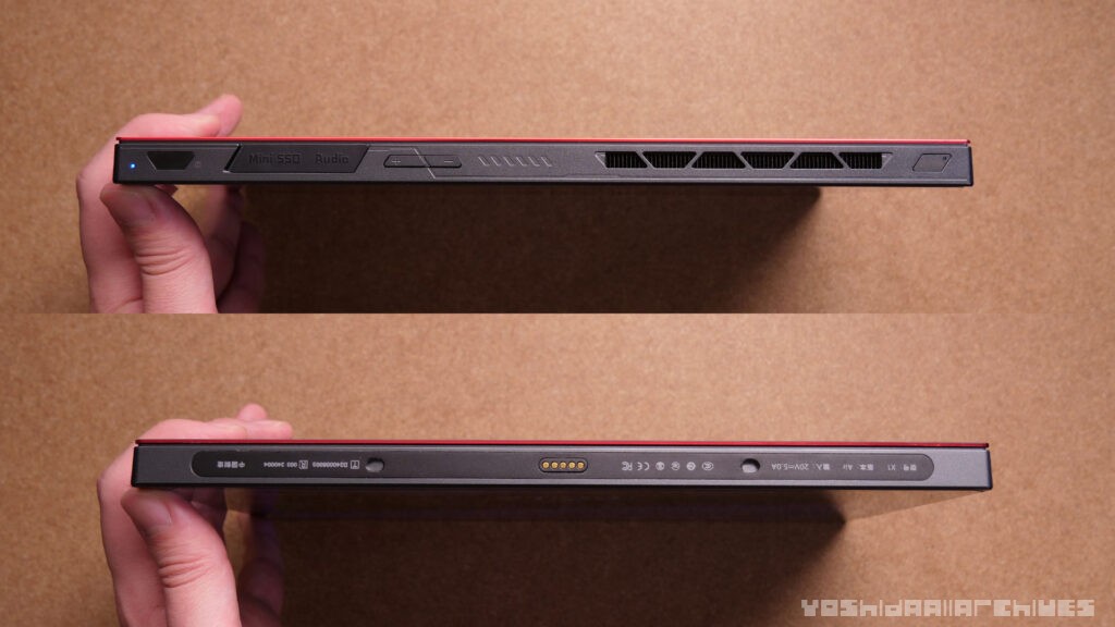 上側面には左から指紋センサー兼電源ボタン、Mini SSD PCle 4.0スロット、3.5mm マイクヘッドフォン兼用ジャック、ボリュームボタン、ファンの排気口、ターボボタンがあります。