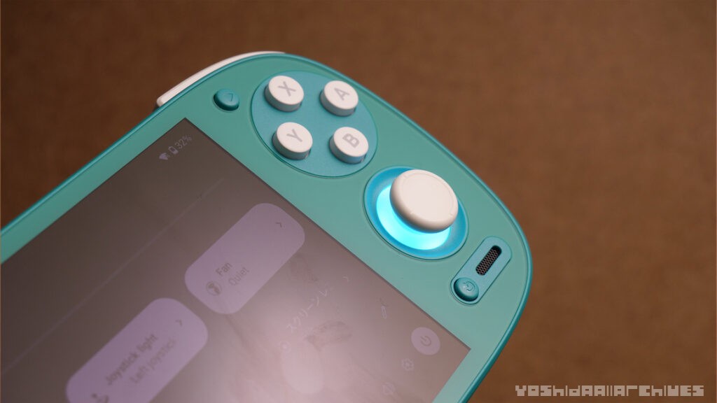 アナログスティックは中央が凹んだもので、Joy-Conや一般的なハードとは違った形状、倒れ角度が大きめです。過去のRetroid Pocket 4/ProやOdin2と同様なトップ。