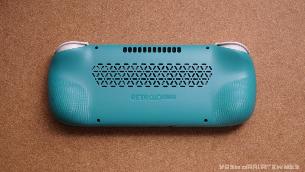 背面には大きくファンの吸気口、排気口もその上にあります。Retroid Pocketのロゴが彫り込みで入っています。