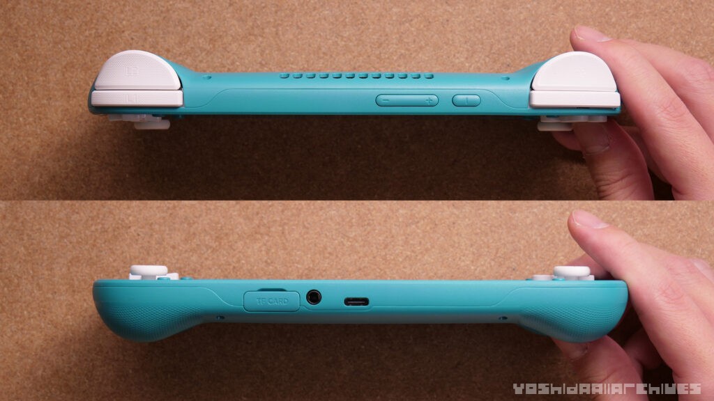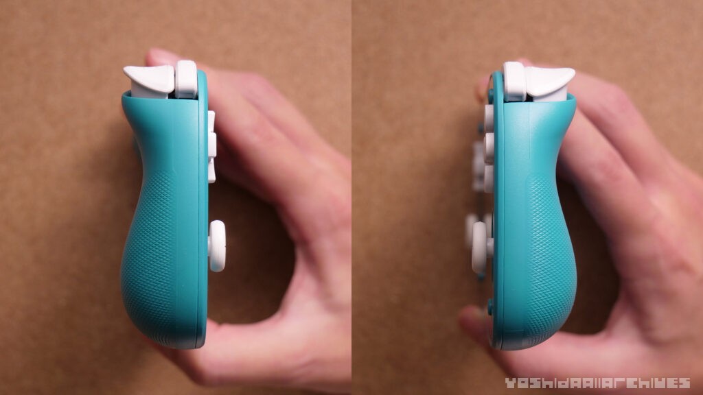ABXYボタンはサラッとして平たいボタンで、遊び少なめ、しっかりとした硬めのラバーの押し心地。十分な感触ではありますが、パチパチと音が鳴る感じと、若干戻りにくい感じ気がします。miniよりも若干硬さは軽めなような。