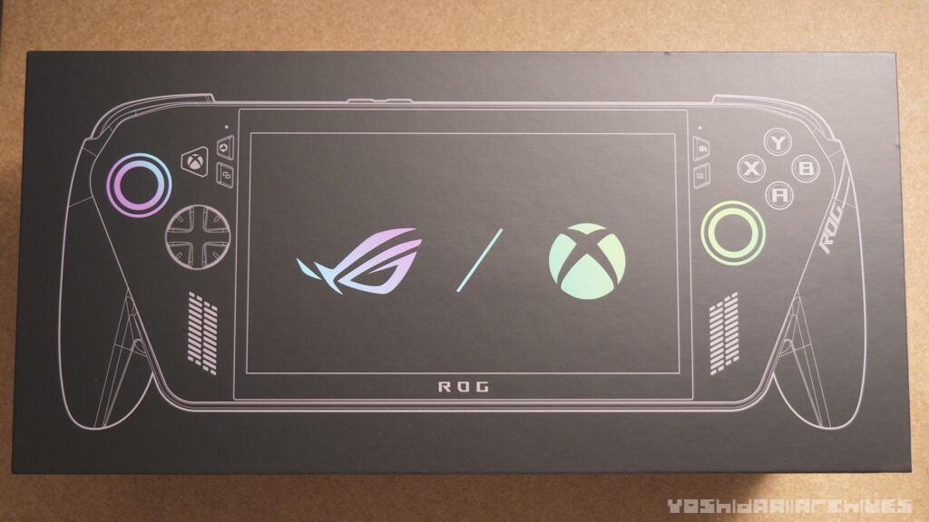 箱はこのように線画のシンプルなデザインで、ガッチリとした梱包です。ROGとXBOXのロゴが並んでいて主張するデザイン。