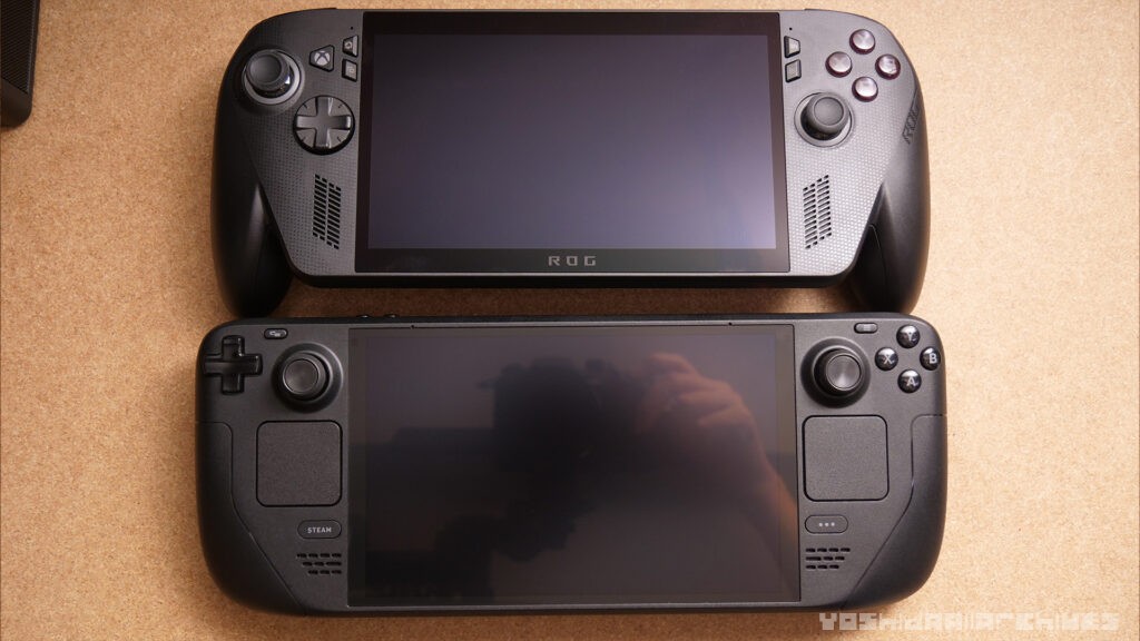 SteamDeckとはぼほぼほ同じサイズ感・画面サイズです。重量やグリップ感の違いは感じます。