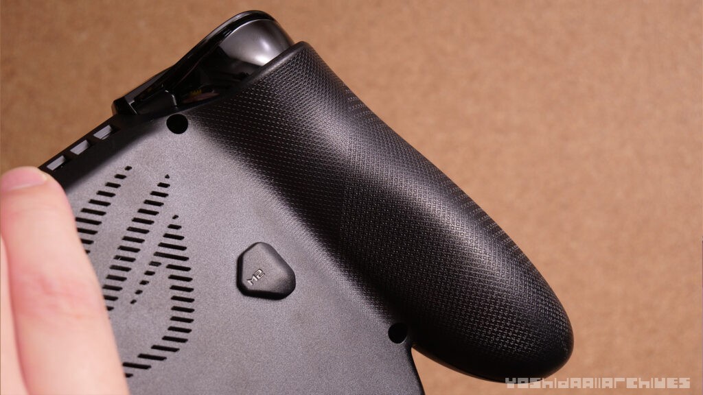 背面ボタンはボコッと浮き出た形状で、普通に握っている分には一切干渉せず、中指を伸ばして押す感じです。結構独特というか、頻繁に使うボタンではないつくりだと感じます。感触はカチカチタクト。