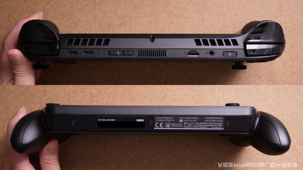 上側面には左からLB/LT、USB4(映像出力・PD対応)、USB 3.2 Gen2 Type-C、ボリュームボタン、通気孔、MicroSDスロット、イヤホンジャック、指紋センサー兼電源ボタン、RB/RT、上にはファンの排気口が左右にあります。