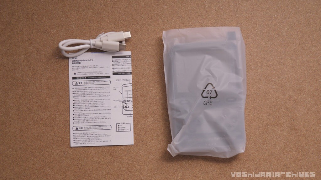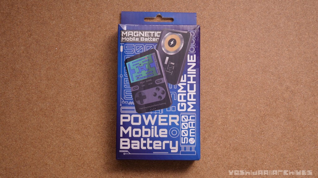 箱はこちら。段ボール製の箱で、商品名が良くわからないのですが、説明書や背面を読むに、『SB-501 退屈禁止のモバイルバッテリー』らしいです。充電速度は記載がなく謎ですが、マグセーフ充電対応の5000mAhバッテリーとのこと。