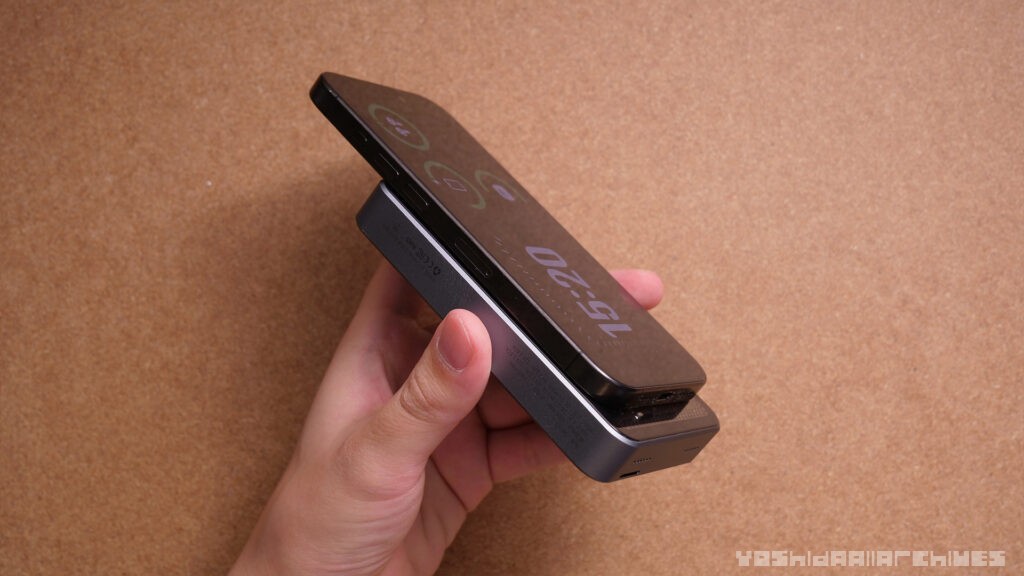 iPhone15 Proに装着してみると、若干のサイズオーバーといった寸法で、かなりバランスが悪く感じます。大きめのケースを付けていたり、Maxだったりするとちょうどいいかもしれませんね。