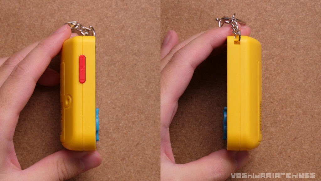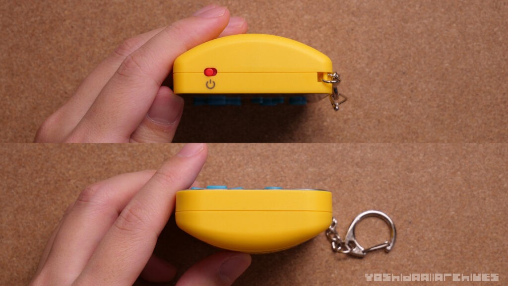 まず最初に手にとって思ったのは、おもちゃみたいでかわいい!です。手に収まるサイズ感、黄色でポップな配色の筐体デザインにグラフィカルなフェイスプレート、そしてデフォルトで装着されているキーチェーン。
