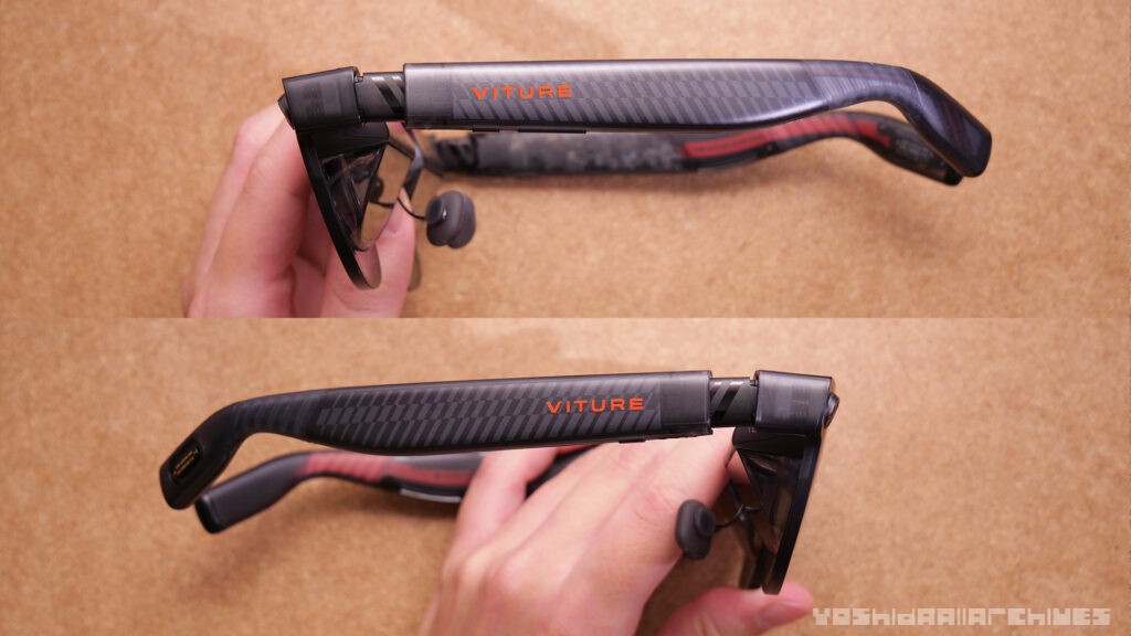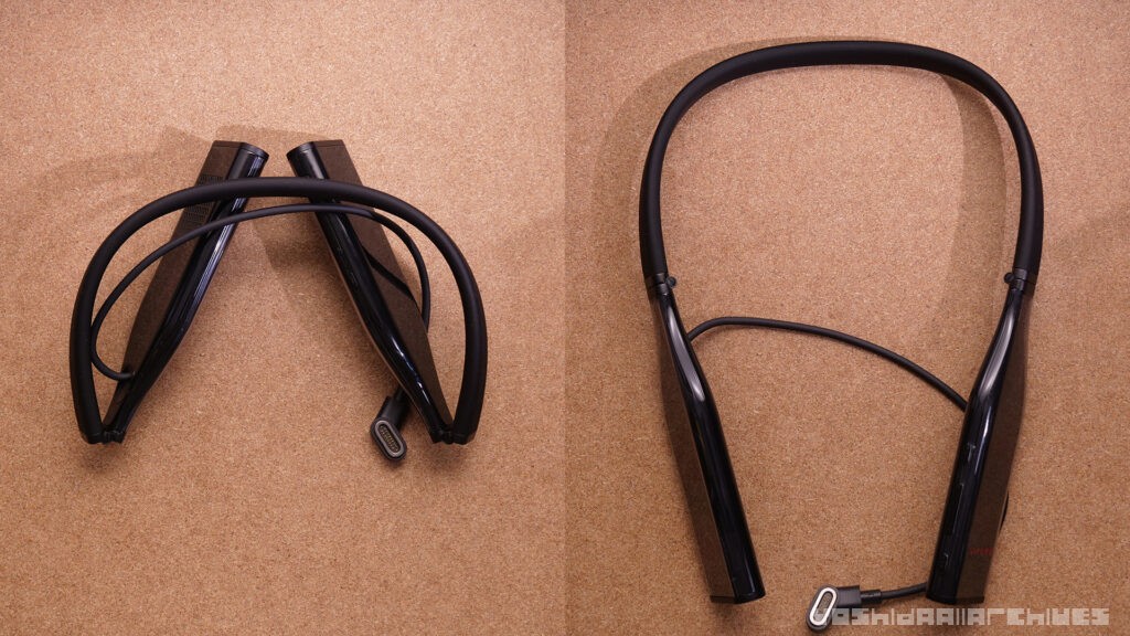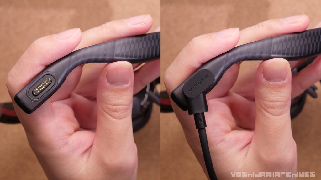 つるの右側にはマグネット端子が搭載されています。ネックバンドはもちろん、付属のUSB-Cもマグネット接続に対応していて、着脱が用意です。これは非常に良いですね。