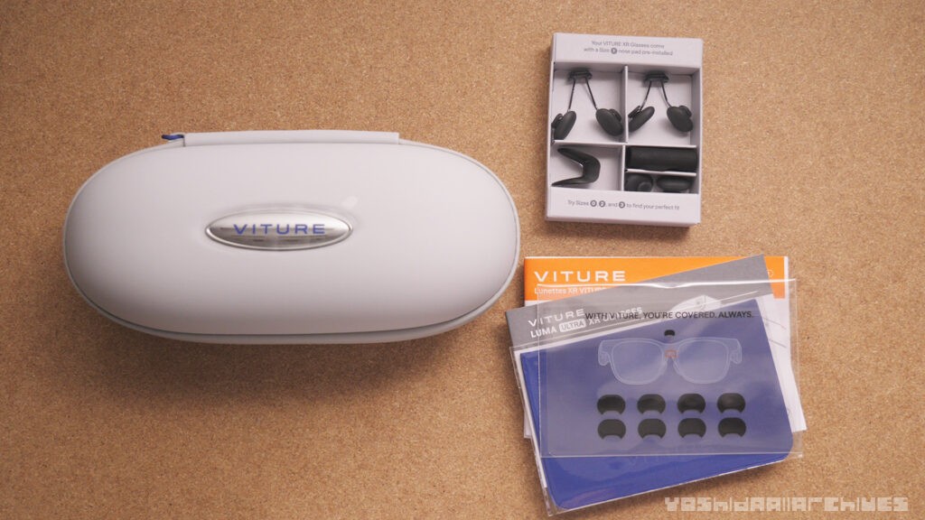 グラス本体の箱を開けるとこちら。ケースに入った本体、説明書類、カメラシール、交換用ノーズパッド、クリーニングクロス、USB Type-Cケーブルです。