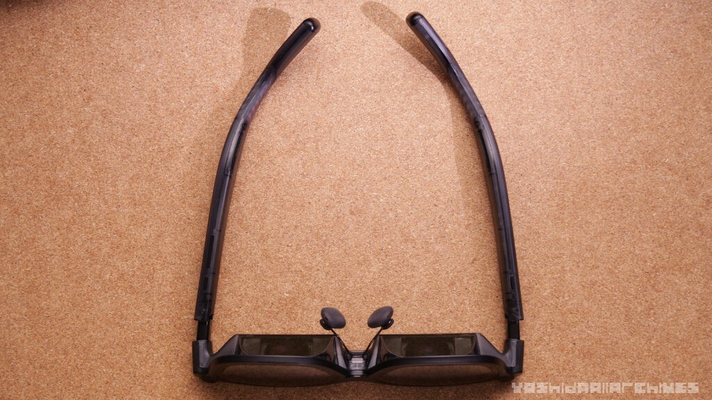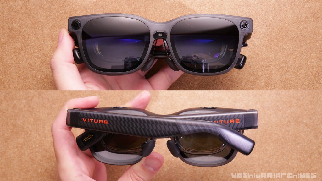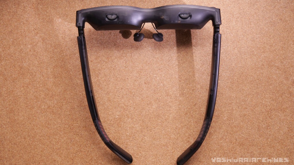 最初に手に取った印象としては、まぁ普通のスマートグラスです。いわゆるサングラス型で、下側から覗き込むような形。そして本モデルには左右と中央に3点レンズが仕込まれています。左右にあるのは深度センサーで、中央にあるのがカメラ。