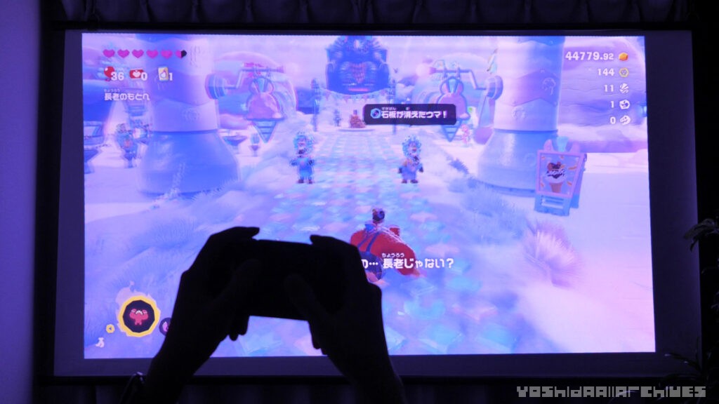 では肝心の投影映像をみてみましょう。一応スクリーンを買ったのでそれを使ってみましたが、4100 ISO ルーメンと実際かなり光量が強くてレンズシフト・光学ズームに対応しているので、そこらへんの白い壁に適当に映しても全然見やすいです。4K対応もしていますし、もうこれ以上無いんじゃないかってくらいの満足感があります。