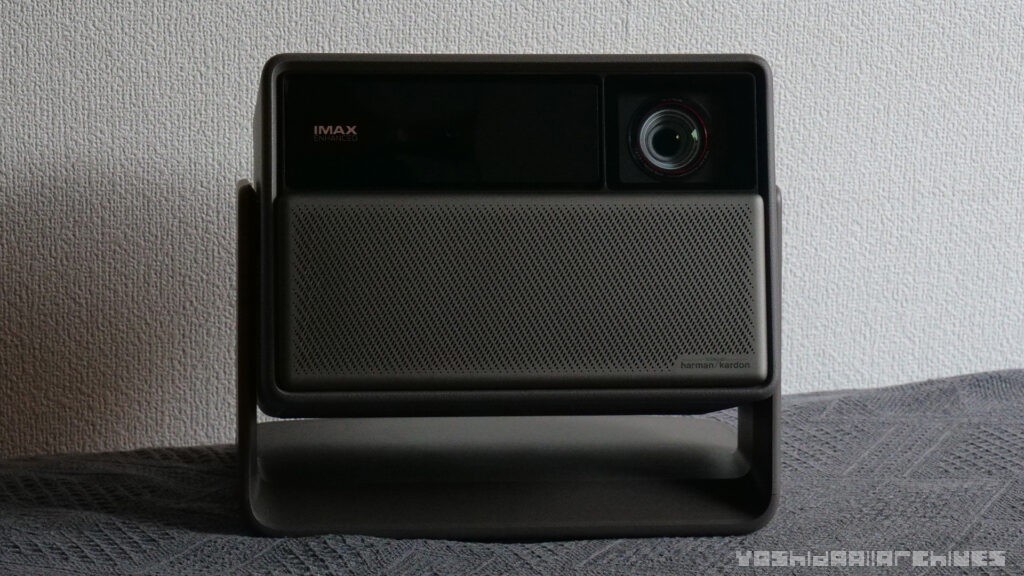プロジェクション部分には保護シールが貼られていて、剥がすとレンズとIMAXの文字が。下部はスピーカーになっていて、Harman/Kardonの文字が。IMAXに対応しているってどういう事?って思って調べてみたのですが、どうやら「IMAX映画館そのもの」ではないが、家庭でIMAXに近い明るさ・色・音・映像比率を楽しめるように調整された規格とのこと。